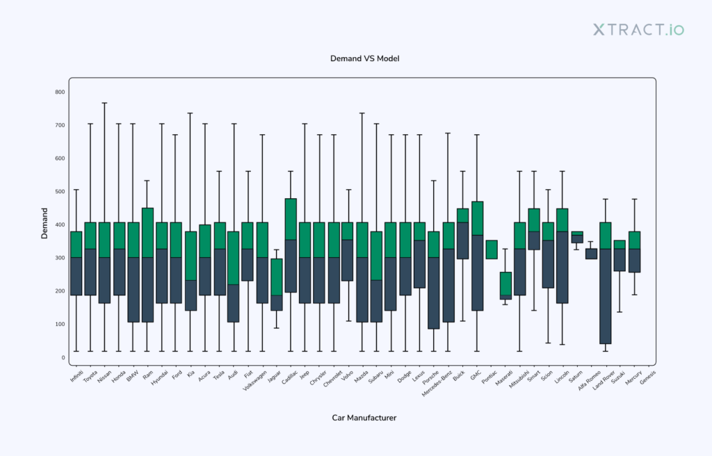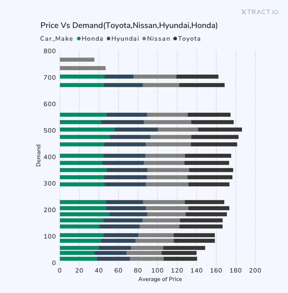 Xtract.io worked closely with the company’s business team to identify the key metrics that had an impact on their demand. A list of 30 key metrics mapped with the demand was analyzed. We identified the top seven metrics that affected the demand namely price, car manufacturer, car model, BlueTooth wireless, 4-wheel drive, car age, and body styles. Thus, our predictive analytics solution enabled the company to forecast the demand and to deploy cars at profitable prices at any time demanded.
